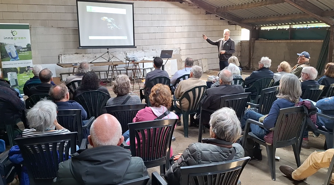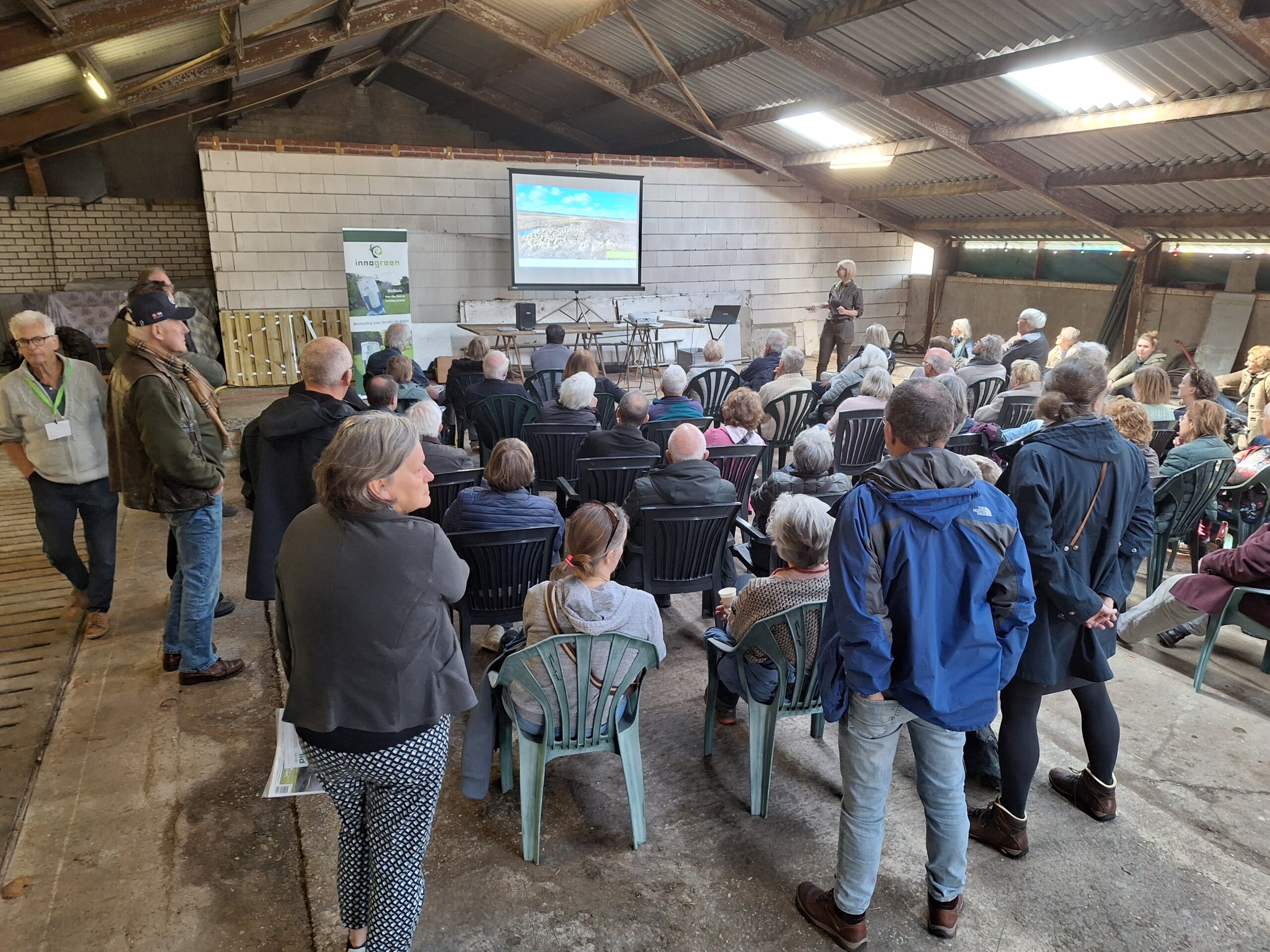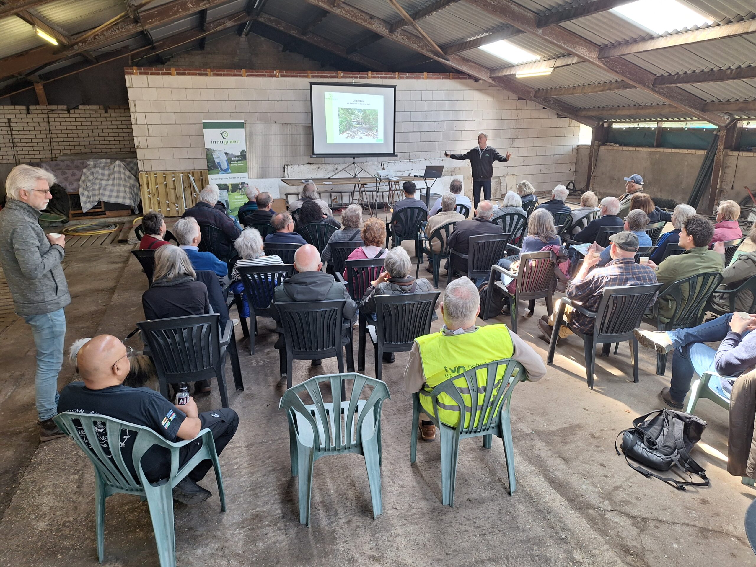 Behalve bij de stands konden belangstellenden ook aan hun trekken komen bij een tweetal voordrachten van Carin de Cloe van Landschap Overijssel en Ruud Snijders van Innogreen. Beide presentaties werden verzorgd in de stallen van De Borkeldzuivel en trokken grote belangstelling (circa 50-60 personen). Mw de Cloe begon bij de bodem en de stuwwallen vanaf de IJstijd in het Overijsselse landschap. Dat mondde uit in een boeiende beschrijving van de vegetatie en het agrarisch gebruik. Haar presentatie is hier te vinden. Op de website van Landschap Overijssel komt nog meer achtergrond voor.